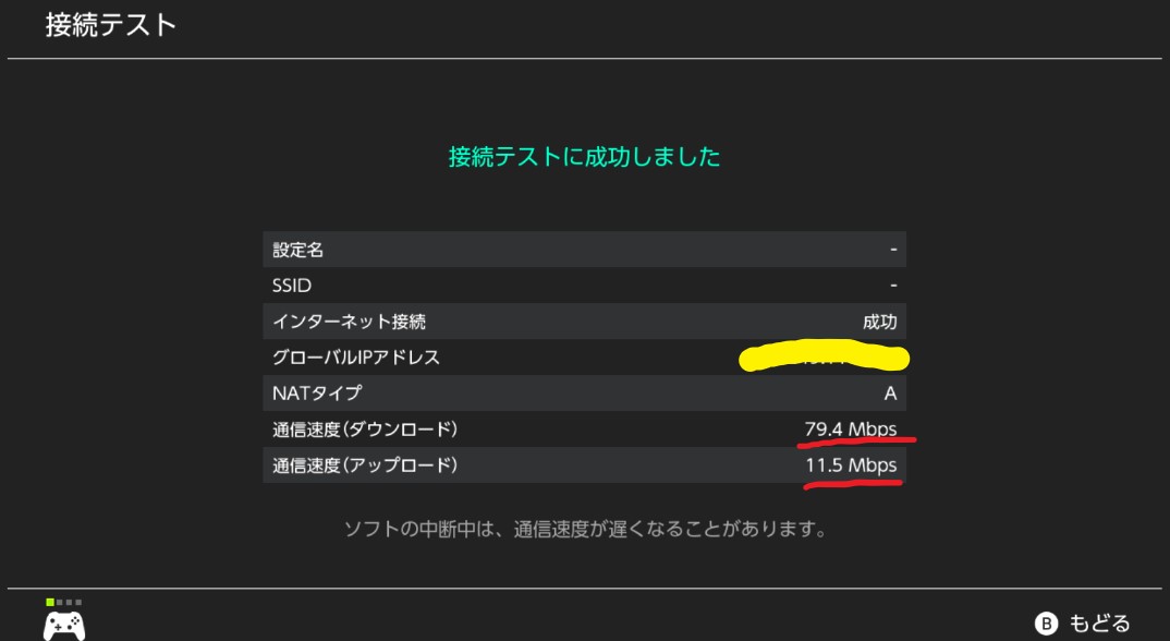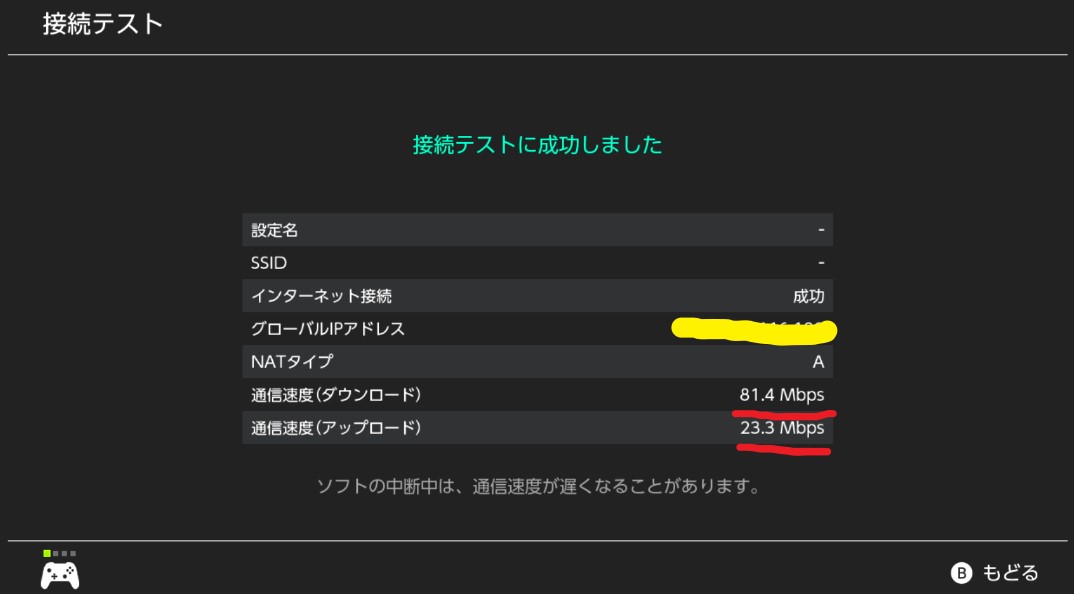 こんな感じの画面になるので通信速度(赤い線を引いた部分)をメモしよう。これで今のスイッチの通信速度がわかりました。